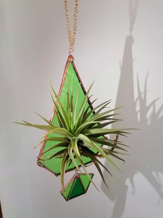 Tavole di legno pirografate con soggetti personalizzati, composizioni floreali, oggetti in vetro lavorati con la tecnica Tiffany, supporti per piante aeree e molto altro.